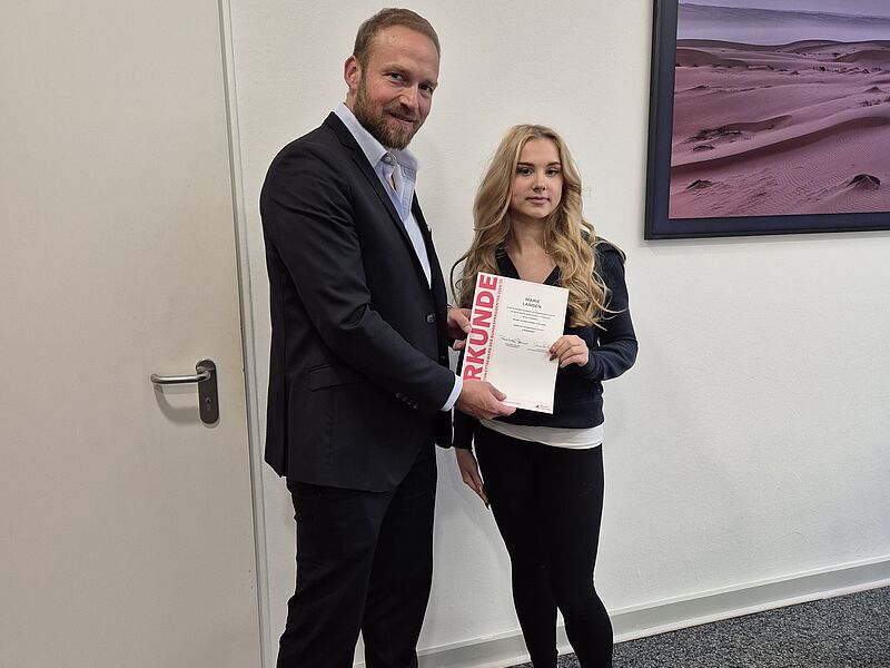Für ihren dritten Bundespreis beim Geschichtswettbewerb des Bundespräsidenten konnte Marie Langen nun ihre Urkunde aus den Händen von Schulleiter Thorsten Korfsmeier entgegennehmen. Der dritte Preis ist mit 750 Euro dotiert.