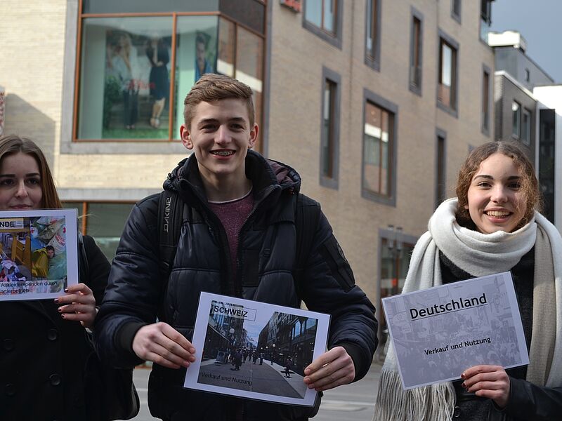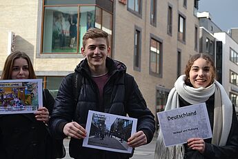 Zusammen mit unserer Erdkundelehrerin Frau Moennighoff und Herrn Paus machten wir, die Schülerinnen und Schüler der Klasse 9c, uns auf den Weg in Münsters Innenstadt. Dort trafen wir uns am Marienplatz mit Jan und Benedikt, zwei ehrenamtlichen Mitarbeitern des Weltladens "la tienda" aus Münster, die uns auf einen ungewöhnlichen Stadtrundgang mitnahmen. Wir sollten das im Unterricht besprochene Thema "Globalisierung" mit seinen konkreten Auswirkungen auf unser Konsumverhalten am Beispiel von Münster erfahren.