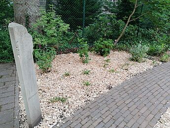 - zwei Sommerflieder, einen Rhododendron, einen gemeiner Schneeball, zehn Immergrün, eine Walnuss gepflanzt,