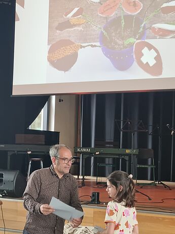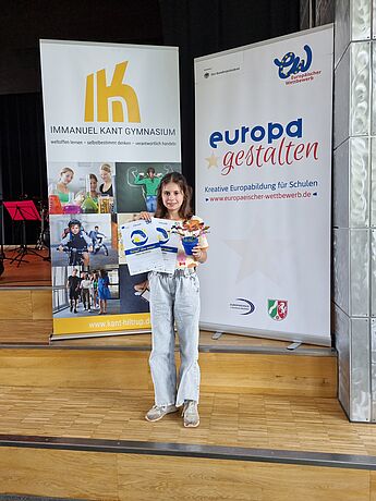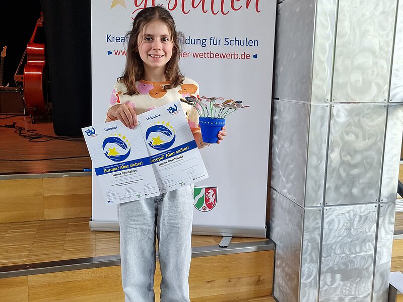 Hanne aus der Klasse 6d hat einen Landespreis beim Europäischen Wettbewerb gewonnen. Die Preisverleihung fand im Immanuel Kant Gymnasium in Hiltrup statt. Mit dabei hatte Hanne ihre Wettbewerbsarbeit: eine EUROPA-Blume, die sie selbst im Rahmen von Projekttagen zum Thema "Europa - fantastisch gewachsen" aus verschiedenen Materialien gestaltet hat.