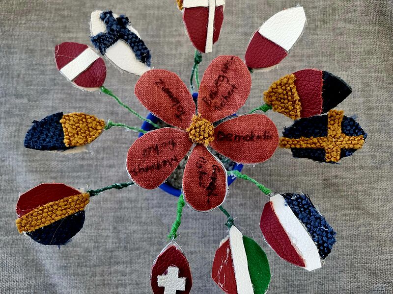 "Ich habe die Blume bunt gestaltet und den Topf blau mit gelben Sternen angemalt, weil der Topf die Europa-Flagge darstellen soll. In der Mitte wächst eine Blume, die symbolisch für Europa steht. Sie steht im Mittelpunkt und darauf zu lesen sind: Toleranz, Bewegungsfreiheit, Toleranz, Gerechtigkeit und Meinungsfreiheit", erklärt Hanne. "Weil das die Werte von Europa sind, habe ich die Blume bunt und wunderschön gemacht. Auf den Blättern findet man die Flaggen von bekannten europäischen Ländern, die ich aus Draht und Stoff gebaut habe." Die Botschaft ist klar formuliert: Die Pflanze kann nur gut wachsen, wenn es allen Teilen der Pflanze gut geht!