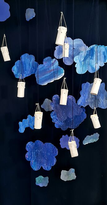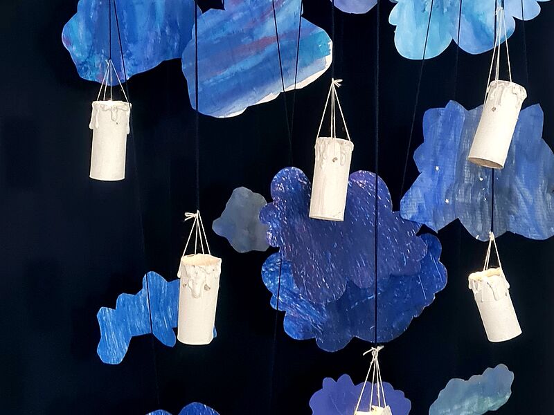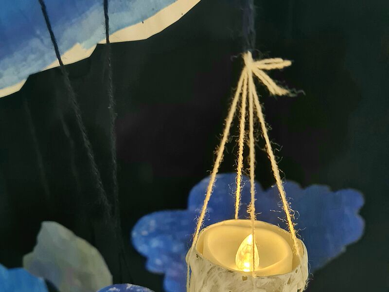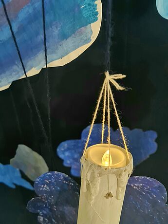 Während der Weihnachtszeit gestalten die Schülerinnen und Schüler eine Lichtinstallation und lernen so den Hell-Dunkelkontrast künstlerisch zu nutzen. Erst durch den dunklen Hintergrund entfalten die schwebenden Kerzen so richtig ihre magische Wirkung. In den kurzen und kalten Tagen können die Betrachter von den jungen Künstler:innen etwas Wichtiges lernen: