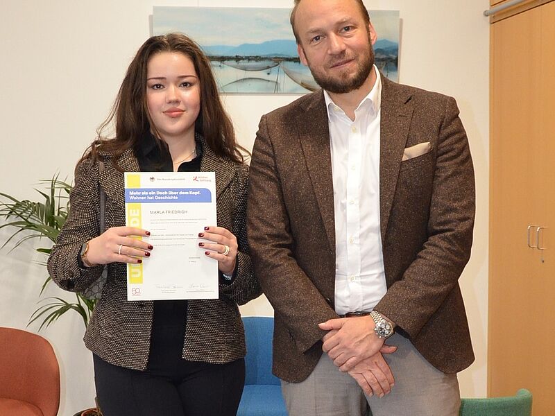 Mit der heutigen Bekanntgabe der Bundespreise endet der diesjährige Geschichtswettbewerb des Bundespräsidenten, der sich mit der Geschichte des Wohnens beschäftigt hatte. Und damit ist es offiziell: Marla Friedrich darf sich über ihren Bundespreis freuen, der mit 750 Euro Preisgeld dotiert ist. Nachdem ihr Beitrag mit einem Landessieg bedacht worden war und sich damit für die nächste Runde qualifiziert hatte, konnte sie sich nun auch auf Bundesebene über ihre Auszeichnung freuen.