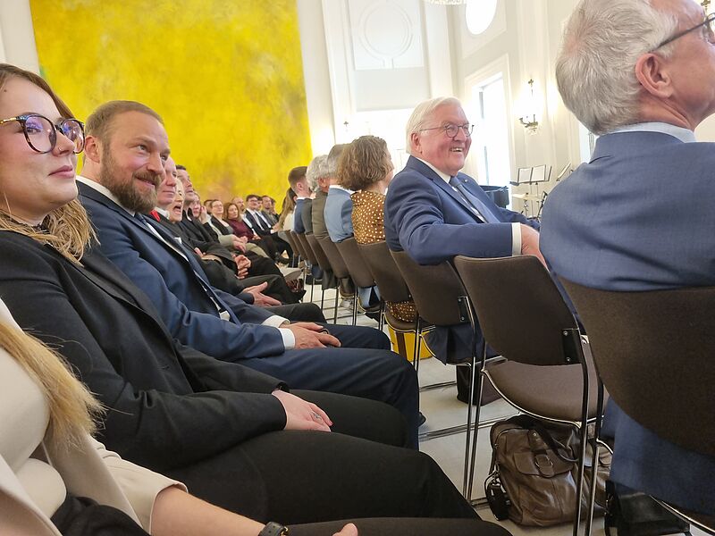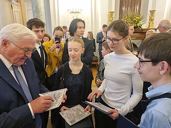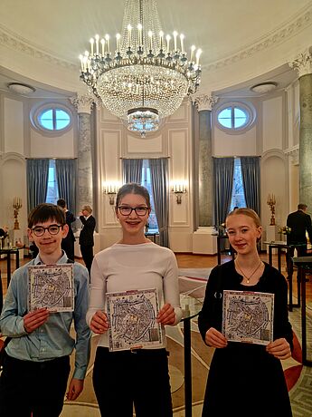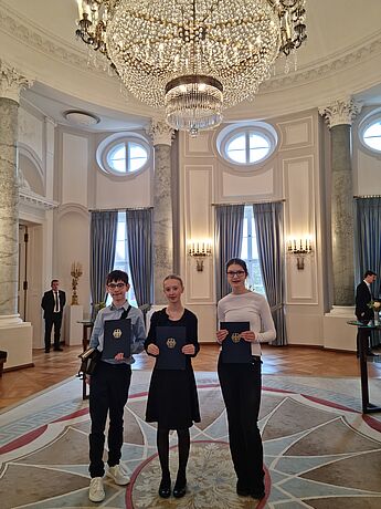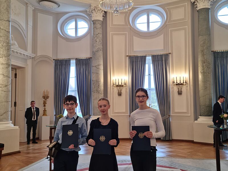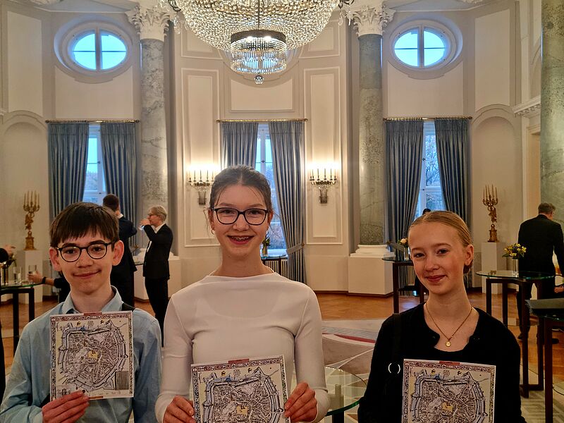 Am heutigen Dienstag, dem 11.11.2025 wurden die drei Hittorf-Schüler:innen vom Bundespräsidenten Frank-Walter Steinmeier persönlich ausgezeichnet und durften im Schloss Bellevue ihr Projekt "Das Gesellschaftsspiel: UTOPIA? Die Stadt der Täufer - soziale, politische und moralische Grenzen in Münster (1533-1536). Drei Perspektiven“ vorstellen.