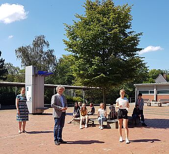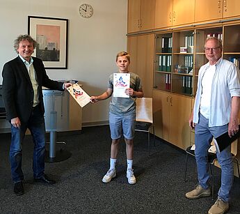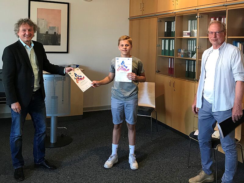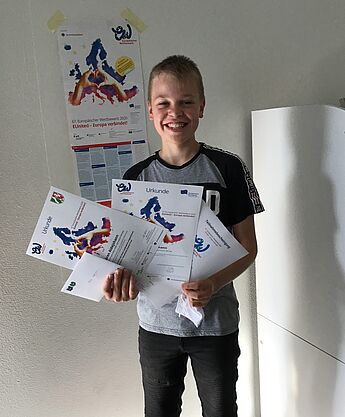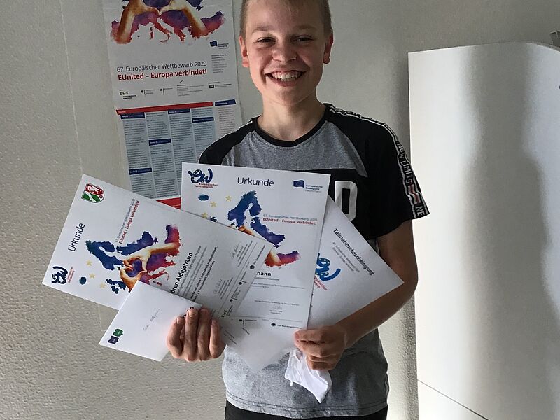 Einen Landes- und Bundessieg beim Europäischen Wettbewerb konnte Luca Knickelmann aus der 9. Jahrgangsstufe erringen. Im Rahmen seines Wahlpflichtkurses Europa hatte er eine Werbekampagne entworfen, mit dem Ziel, die epochalen Errungenschaften Europas als Friedensraum in Erinnerung zu rufen. Auf großformatigen Plakaten konnte er die zentralen europäischen Zielvorstellungen von Sicherheit, Zusammenarbeit und Freiheit gelungen in Szene setzen. Der Lohn für seinen Beitrag: zwei Urkunden, ein Geldpreis in Höhe von 50 € sowie ein Buchgeschenk.
