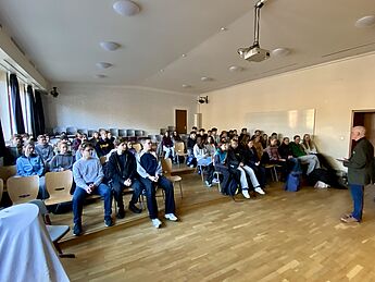 In diesem Rahmen war das Ensemble Compania des Theater Münsters zu Gast und spielte vor ausgewählten Schüler*innen der 9. und 10. Klassen Musik aus den Konzentrationslagern. Die bewegenden, emotionalen Werke erzählten von Hoffnung, Angst und Menschlichkeit in unmenschlichen Zeiten. Aufwühlend und ergreifend erzählte die Musik die Geschichte einzelner Komponist*innen, deren Leben und Schaffen untrennbar mit der Verfolgung durch das NS-Regime verbunden waren.