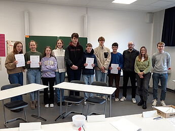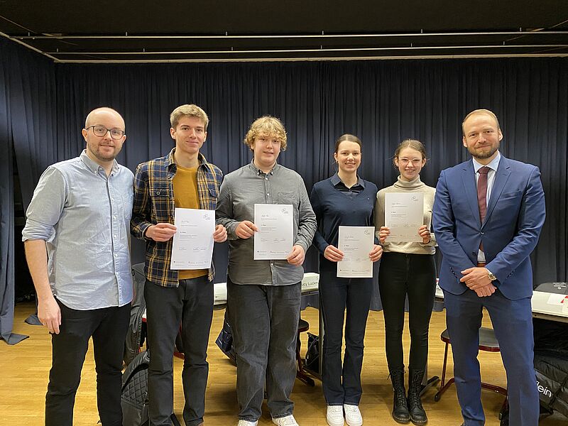 Die Sieger:innen der beiden Altersstufen werden auf dem Regionalwettbewerb das Hittorf vertreten und von ihren Finalist:innen – Alexandra Wittlage, Florian Gosejohann (beide 9. Klasse) und Lucy Luckmann, David Klose (EF) – unterstützt.