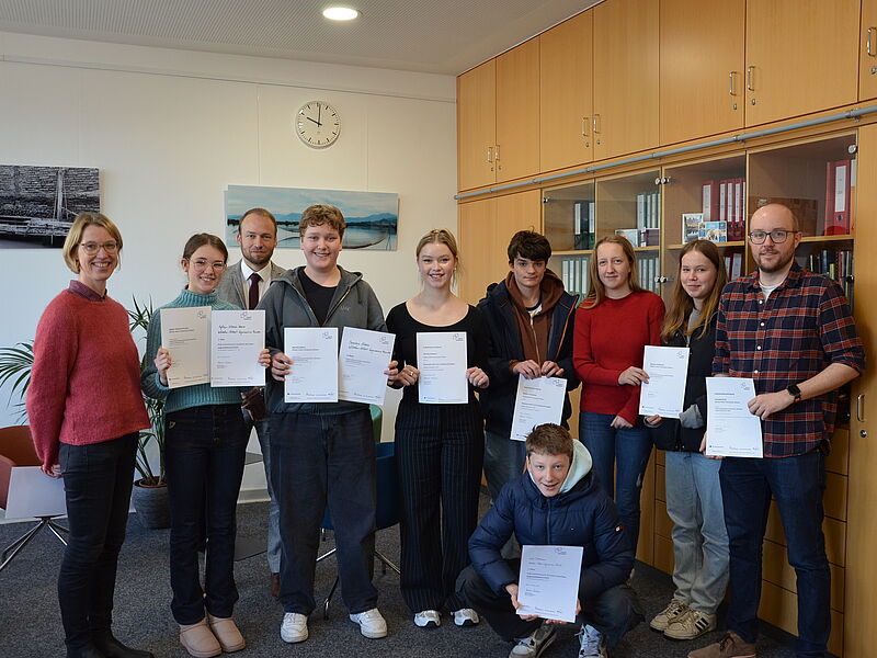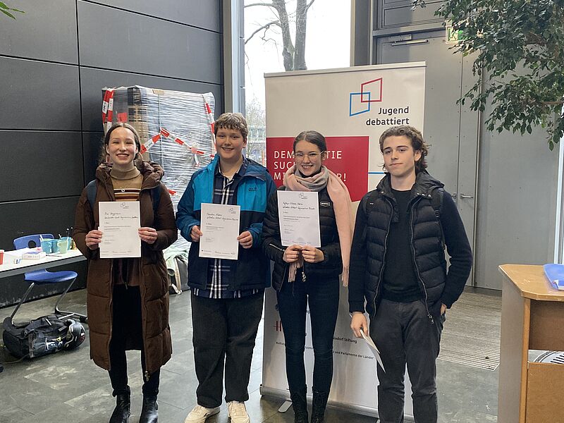 Alle teilnehmenden Schüler:innen konnten dem Schulleiter, Herrn Korfsmeier, von der interessanten und erfolgreichen Teilnahme bei Jugend debattiert berichten. Herr Korfsmeier lobte das Engagement und die Erfolge bei diesem Wettbewerb gerade in Zeiten, in denen demokratisches und konstruktives Streiten wertvoller denn je ist.