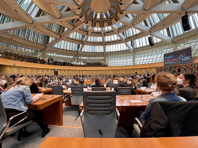 Als Teilnehmer am Regionalsiegerseminar war ich zudem eingeladen, das Landesfinale von „Jugend debattiert“ am 08. April in Düsseldorf im Landtag NRW zu besuchen. Also brach ich am Freitagmorgen mit dem Zug auf zum Finale. Meine fantastische Begleitung bestand aus Jakob Kronlage und Ludger Tenbohlen (beide EF), die auf Schulebene erfolgreich debattiert hatten. Wir hatten in Düsseldorf einen unheimlich spannenden und begeisternden Tag. Nachdem wir es in den Landtag geschafft hatten, begann die Veranstaltung um 13:00 Uhr. Wir saßen dabei als geladene Gäste mitten im Herzen der Demokratie: Im Plenarsaal des Landtages.