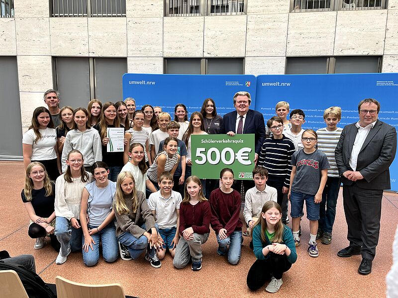 Minister Oliver Krischer und der Präsident der Landesverkehrswacht NRW Klaus Voussem haben den Schülerinnen und Schülern den Preis über 500€ in der Kategorie „Beste Klasse“ (unter allen teilnehmenden Gymnasien) überreicht. Insgesamt haben 22.000 Schülerinnen und Schüler aus ganz NRW beim Schülerverkehrsquiz teilgenommen.