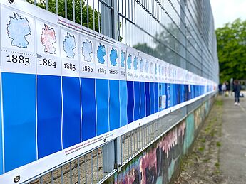 Das Banner zeigt blaue und rote Jahresstreifen, die sogenannten „warming stripes“, die der Klimawissenschaftler Ed Harris entwickelt hat, um die fortschreitende Erderhitzung mittels einer Farbskala verständlich und anschaulich zu machen. Anhand des Verlaufs von blauen zu roten Streifen wird sofort begreiflich, wie rasant die durchschnittliche globale Temperatur von 1850 bis 2018 - besonders in den letzten drei Jahrzehnten - angestiegen ist. Jeder dieser Jahresstreifen ist 12 cm breit - pro Monat 1 cm - jedes Jahrzehnt umfasst 120 cm, nach 12 Metern ist bereits ein ganzes Jahrhundert, 3-4 Generationen, durchschritten. Bei deiner Erkundung von 250 Jahren Klimaforschung kann man ganz links im Jahr 1850 - jenes Jahr, in dem die systematische Erforschung und Messung der globalen Temperatur begann, beginnen.