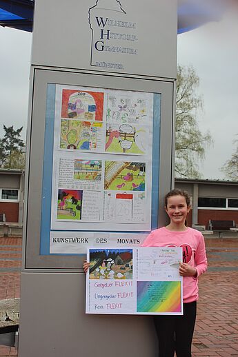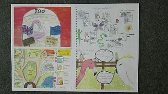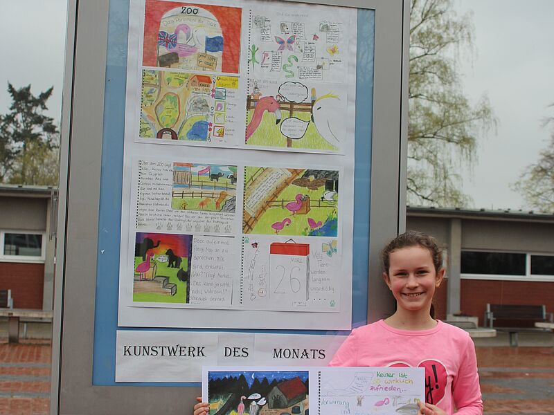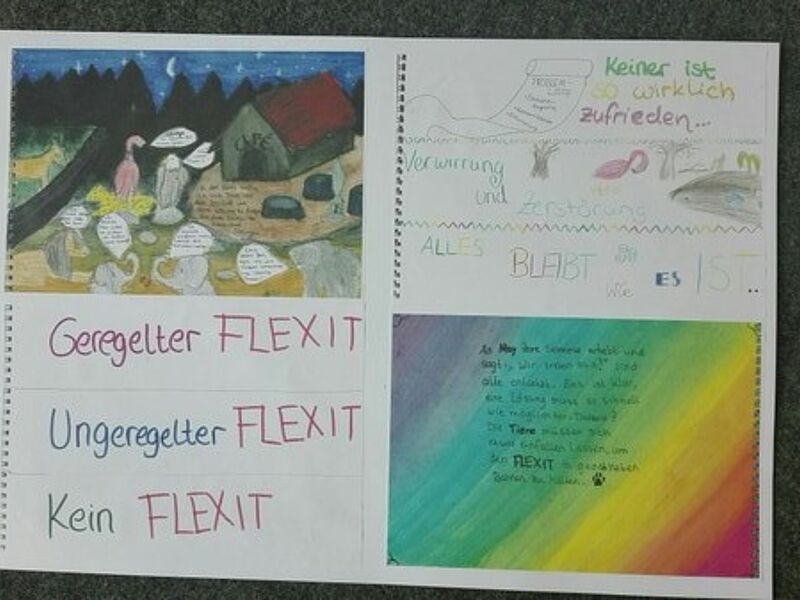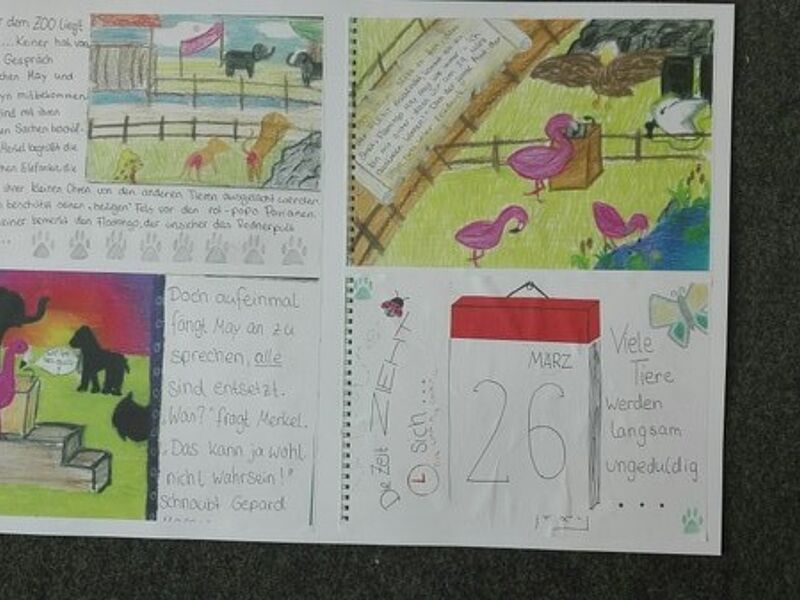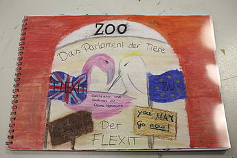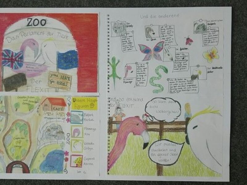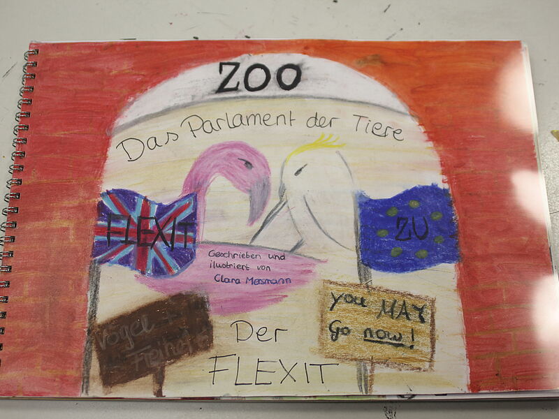 Clara Mersmann, Schülerin der Klasse 6d, ist Autorin und zugleich Illustratorin des aktuellen Kunstwerks des Monats, in dem sie sich mit dem brandaktuellen Thema "Brexit" auseinandersetzt. Mit Witz und Fingerspitzengefühl vergleicht Clara das aktuelle Geschehen in Großbritannien mit der Situation in einem Zoo, in dem u.a. Elefant Merkel, Flamingo May und Gepard Macron leben. Als die Flamingos aus der Zoo-Gemeinschaft austreten wollen ("Flexit"), kommt es zu Diskussionen der Tiere untereinander: Optionen werden durchgesprochen, Konsequenzen durchdacht!