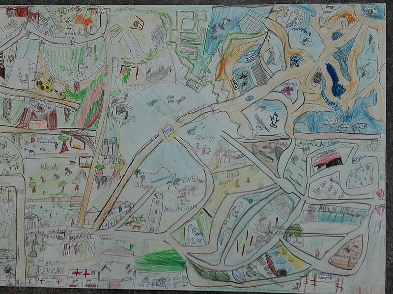 Die Klasse 5d entwickelte innerhalb eines interdisziplinären Projektes (Tiere/Wege beschreiben und zeichnen) eigene Phantasie-Zoo-Karten. In 4er-Gruppen wurden Tiere in Gehege gezeichnet, Rundgänge durch den eigenen Zoo konzipiert und so manche Rätsel für BetrachterInnen eingebaut (z.B.einige Phantasietiere).
