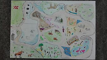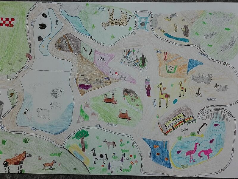 Besonders herausragend gelungen sind die Ergebnisse der Kinder Theo, Jaron, Emil R. und Mio (Bild 1) und Linnea, Antonia, Matilda und Marlene (Bild 2). Diese Zoo-Karten wurden bereits in einer Feedbackrunde der Klasse in Bezug auf Kreativität und Darstellung der Tiere und Wege besonders gelobt und sind verdientermaßen als "Kunstwerke des Monats April" ausgewählt worden.