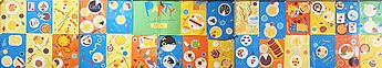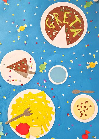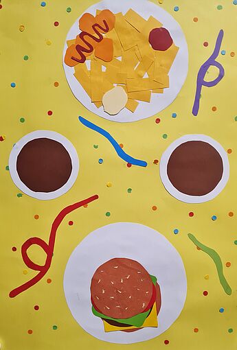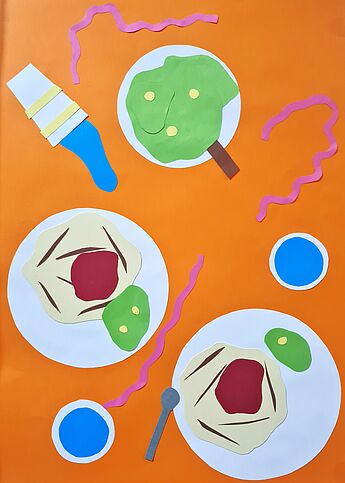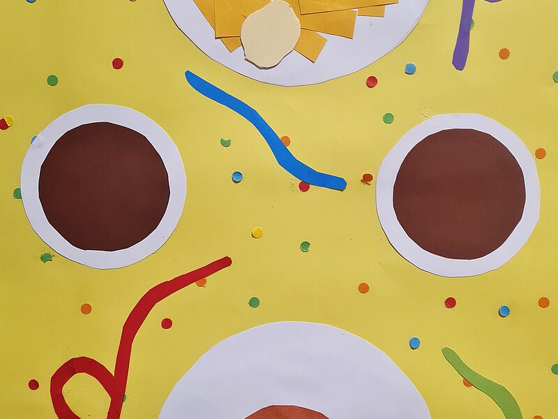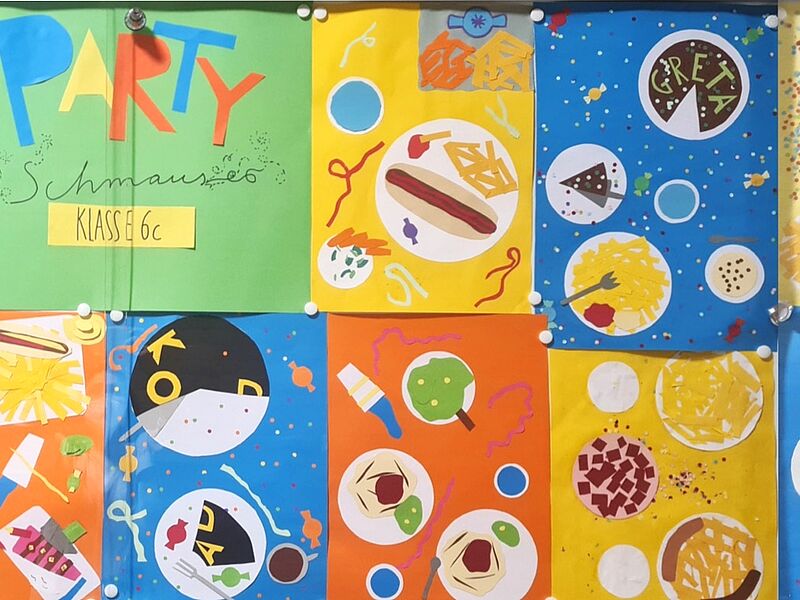 Bunte Formen und Farbflächen breiten sich über den Schulflur zu einem lebensfrohen Klassenkunstwerk aus. Die neue Vitrine vor dem großen Zeichensaal ist von den Künstler*innen zu einer großen, einladenden Festtagstafel eingedeckt worden. Dafür haben die Schüler*innen der 6c nicht mit Farbe und Pinsel gemalt, sondern mit der Schere! Die bunten Speisen wurden ausgeschnitten und finden unter Verwendung der Ordnungsprinzipien neu zusammen. Aus runden Formen werden Teller oder Geburtstagstorten, schmale Streifen werden zu Pommes, garniert mit geschwungenen Ketchup-Linien. Konfetti und Luftschlangen krönen den Partyschmaus.