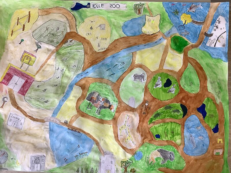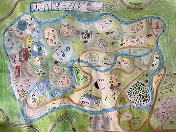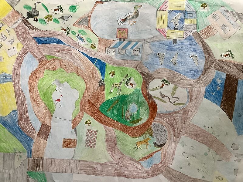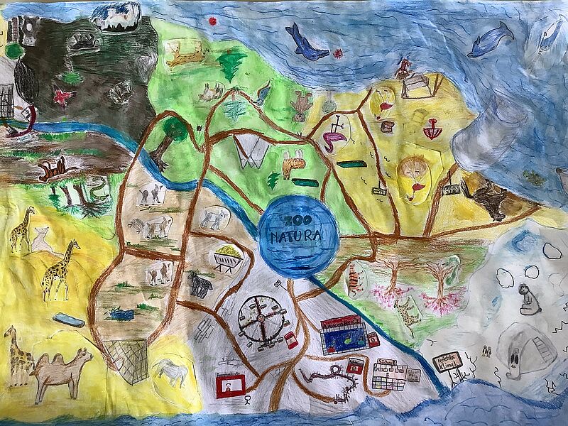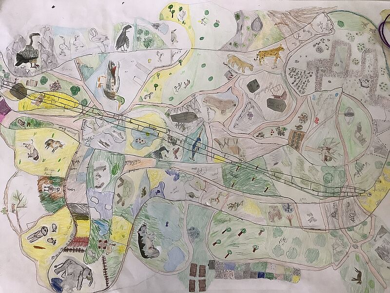 Nachdem die Kinder sich im Unterricht zunächst detailliert mit dem Zeichnen von Tieren beschäftigt hatten, überlegten die Fünftklässler*innen anschließend in Gruppenarbeit, welche Tiere in ihren Phantasie-Zoos einen Platz finden sollten, ob die Besucher*innen auf Wegen oder kleinen Wasserstraßen den Zoo erkunden sollten und was sie darüber hinaus noch erleben konnten. So lassen sich auf diesen Kunstwerken des Monats im Detail kleine Brücken, Spielplätze, Seilbahnen, Buden mit köstlichen Leckereien, aber auch versteckte Rätsel finden, die zeigen, mit wieviel Freude, aber auch guten Absprachen die Gruppenarbeit betrieben wurde.