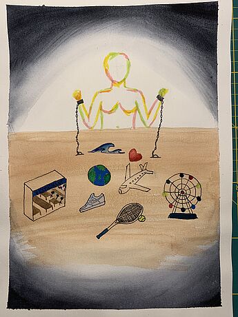 Das Bild des Monats April von Janne Oelerich (EF) ist im Zusammenhang mit dem Thema „Menschen am Tisch“ in der Zeit des Distanzunterrichts entstanden. Janne hat ihr Motiv auf die aktuelle Corona-Lage bezogen. Sie selbst erklärt ihr Bild, welches mit malerischen und zeichnerischen Mitteln umgesetzte wurde, folgendermaßen: „Mit dem Bild wollte ich die Lage in Zeiten von Corona ausdrücken. Die bunte, lebendige und strahlende Figur, die an einen Tisch gekettet ist, will all das erleben, was auf dem Tisch zu sehen ist und in ihren Alltag einbinden, doch sie ist angebunden und kann die Dinge nicht greifen. Sie sitzt in einem langweiligen und ungemütlichen Raum, der keine Abwechslung zeigt. Das einzig Schöne in dem Raum sind die Dinge, die die Figur hofft, bald wieder zu erleben".