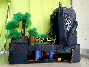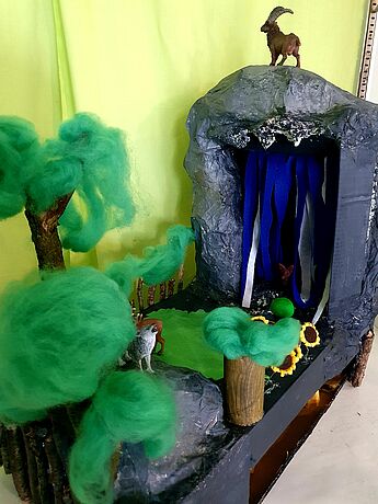 Das Bild des Monats Mai von Connor Biermann (6c) ist ebenfalls während des Distanzunterrichts entstanden. Hier ist zum Thema "Modellieren" bzw. Gestaltung eines Kartons ein wirklich außergewöhnliches Projekt abgegeben worden. Connor hat zwei Kartons miteinander durch Pappmaschee verbunden, bemalt und zu einer Tierwelt ausgestaltet, auf der sich unterschiedliche Tiere befinden. In der unteren Ebene befindet sich eine Tropfsteinhöhle, die durch den Wasserfall entstanden ist. Das Werk besticht nicht nur durch die gute Form- und Farbgestaltung, sondern auch durch die Größe des Projekts. Hier ist viel Arbeit und Gestaltungseifer eingeflossen.