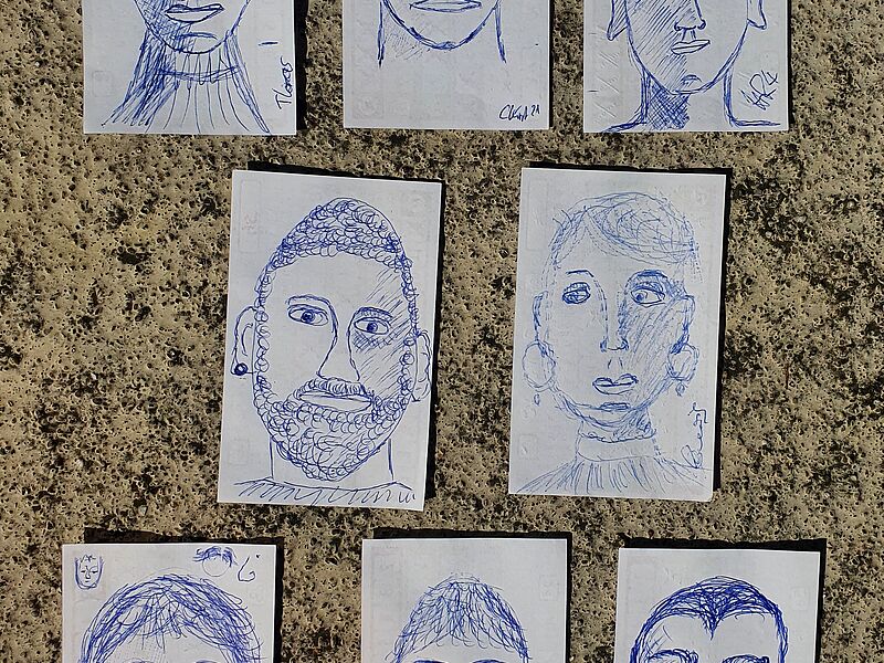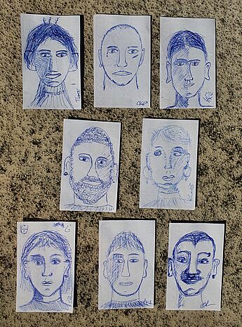 Aber was ist eigentlich "Kunst"? Ist es nicht auch das Ausprobieren, das Anfangen, das Unterwegssein im eigenen künstlerischen Tun und Gestalten? Die Kunstwerke des Monats August stellen genau diesen Aspekt von künstlerischem Schaffen in den Vordergrund. Die ausgestellten Portraits wurden mit Kugelschreiber auf die Rückseite von Zetteln eines Gesellschaftsspiels gezeichnet - sie wollen nichts sein und genau darum geht es dabei!