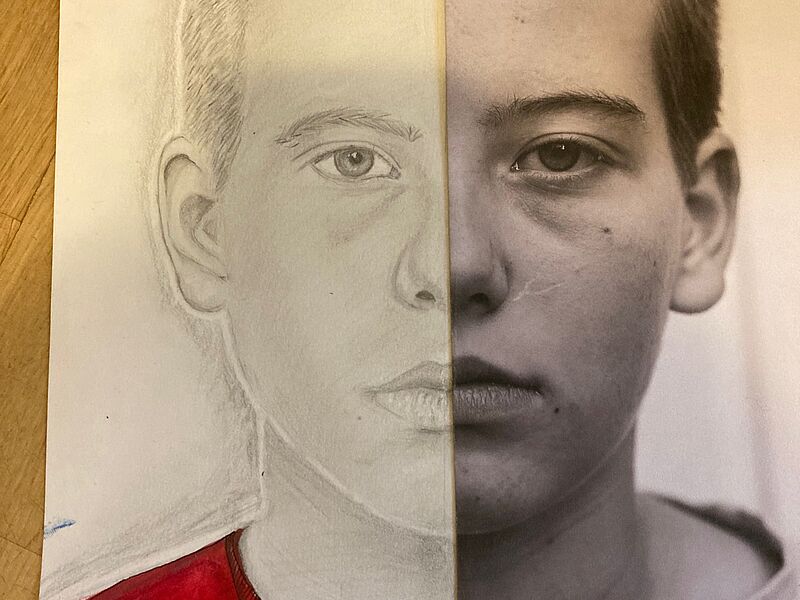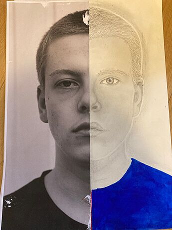 Ausgangspunkt war ein Foto von sich selbst, auf dem die Schülerinnen und Schüler in Frontalansicht zu sehen waren. Diese Fotos wurden in einem ersten Gestaltungsschritt längs halbiert. Eine der beiden Hälften war dann die Basis für die Gestaltungsaufgabe, die darin bestand die nun fehlende Hälfte so zu ergänzen, dass eine andere Seite der jeweils abgebildeten Person dargestellt werden konnte.