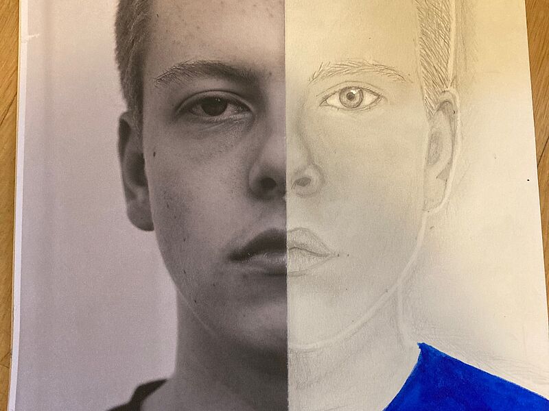 Berit Elshof hat eine sehr außergewöhnliche Bildergänzung gewählt: Sie machte ein Foto von ihrem Bruder in einer annähernd identischen Ansicht wie Ihrem, zerschnitt auch dieses Foto längs und ergänzte sowohl ihre Porträthälfte zeichnerisch als auch eine ihres Bruders und fügte sie zu einem Porträt zusammen und das während des Gestaltungsprozess. Bild 1 und 2 zeigen den Entstehungsprozess ihres Kunstwerks.