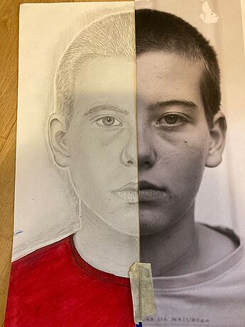 Das Ergebnis zeigt Berit selbst auf der linken Seite (rotes Shirt) und ihren Bruder auf der anderen Seite (blaues Shirt), wenn man allein von dem handwerklichen Prozess ausgeht. Kennt man den Entstehungsprozess nicht, sieht man ein Porträt einer Person, der man auf den 1. Blick nicht ansieht, dass sie aus zwei verschiedenen Personen besteht. Diesen Eindruck hat Berit einmal durch ihre unglaubliche zeichnerische Präzisionsfähigkeit erzeugt und durch ihr Talent, das abzubilden mithilfe eines Bleistiftes, was sie sieht, bis ins kleinste Detail. Dieser sehr hohe Naturalismusgrad in Berits Zeichnung ist kaum zu übertreffen. Aber auch inhaltlich stellt diese Arbeit eine kreative und beindruckend private Auseinandersetzung und Darstellung mit sich selbst dar: Zwei Personen, Bruder und Schwester, die irgendwie eins sind und untrennbar miteinander verbunden zu sein scheinen.