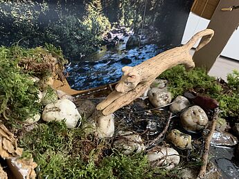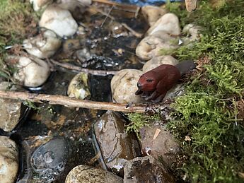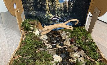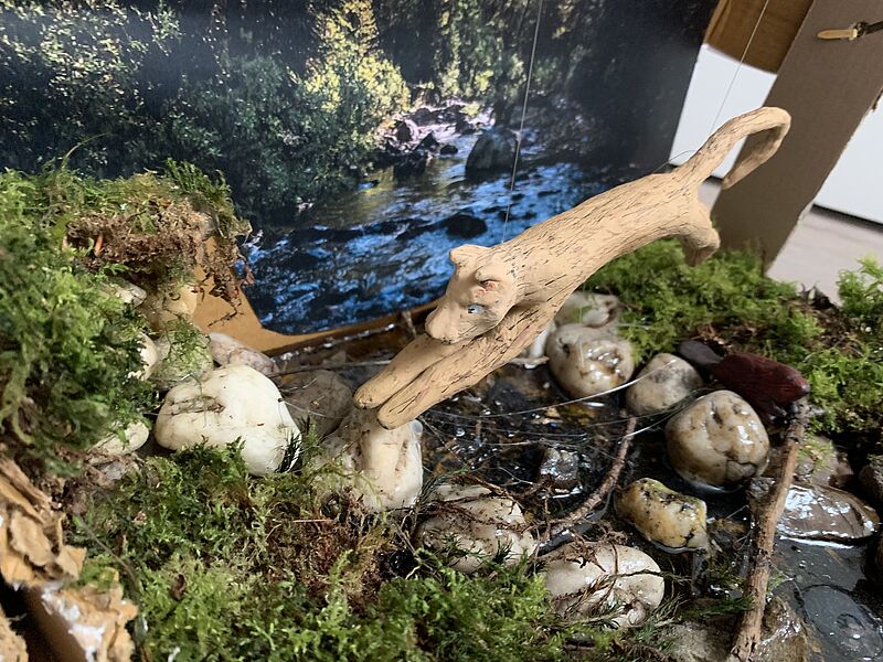 Das Kunstwerk des Monats Februar stammt von Moritz Fechte aus der 6b. Entstanden ist es während des Lockdowns. Das vorgegebene Thema war: "Tiere in ihrer Umgebung". Bei Moritz handelt sich um einen Puma in seiner Landschaft. Sein Kunstwerk trägt daher den Titel „Puma“. Moritz gestaltete sein Werk als Collage, aber diesmal nicht als zweidimensionales Werk auf einem Blatt Papier, sondern als Materialcollage in einem Karton, den er zu einer Urwaldumgebung für seinen Puma umgestaltet hat. Den Puma hat Moritz als dreidimensionale Figur aus Fimo geformt und mit Acrylfarbe bemalt. Anschließend hat er Materialien (Bild- und Naturmaterialien) gesammelt, um daraus eine möglichst authentische Umgebung für sein Tier gestalten zu können. Hier hat er sich von den Rocky Mountains inspirieren lassen. Den Puma hat er am Ende im Karton mit Hilfe einer Schnur aufgehängt, sodass er im Moment des Sprunges trotzdem stabil mit dem Karton verankert bleibt. Zudem hat er einen Biber als weiteres Tier modelliert und in die Nähe des Flusses gesetzt. Könnt ihr ihn sehen? Wir finden, ein meisterhaft gelungenes Gesamtkunstwerk, das sowohl durch die sehr gute Tiergestaltung, als auch durch die echt aussehende Umgebung im Karton überzeugt.