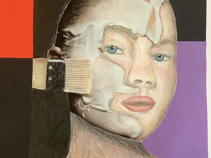 Die Beschäftigung mit dem Thema "Portrait" in der Jgst. 9 geht weiter! Chiara aus der 9a hat eine Collage aus einem Zeitschriftenbild und ihrer eigenen Bildergänzung in der Technik der Buntstiftzeichnung erstellt. Dabei hat sie bei der Umsetzung der Zeichnung sehr auf einen naturnahen Darstellungsmodus und starke Schatten geachtet. Die farbigen Papiere hat Chiara in einem Auswahlprozess gemeinsam mit Hezkirin erst in unterschiedlichen Variationen gelegt und dann in der finalen Komposition zusammengefügt!