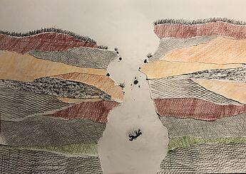 „Mein entstandenes Bild beschäftigt sich mit einer der natürlichsten Ängste des Menschen: dem Fallen. Jeder und jede ist bestimmt schon mal aus dem Schlaf hochgeschreckt mit dem Alptraum in ein endloses Loch zu Fallen. Diese Angst ist mit der Angst vor Zurückweisung, Verlust und Misserfolgen zu begründen. Man befürchtet an etwas zu scheitern, zu versagen oder verlassen zu werden. Der Sturz in eine Schlucht vorbei an den unterschiedlichen Schichten der Erde ins Endlose symbolisiert das. Die Erd- und Gesteinsschichten als Frottageelemente haben die metaphorische Bedeutung der verschiedenen Lebensabschnitte, die bei diesem Sturz bedeutungslos an einem vorbeiziehen.“