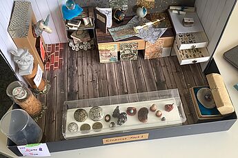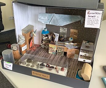 Bei der gestaltungspraktischen Aufgabe „Kunstkammern, Wunderkabinette und Schatzkammern“ hatten die Schülerinnen und Schüler der Klasse 6b den Auftrag, aus einem alten Schuhkarton und vielen weiteren Materialien und Alltagsgegenständen ihre eigene Wunder- oder Schatzkammer in Miniaturform künstlerisch zum Ausdruck zu bringen, wobei alles selbst hergestellt werden sollte.
