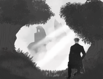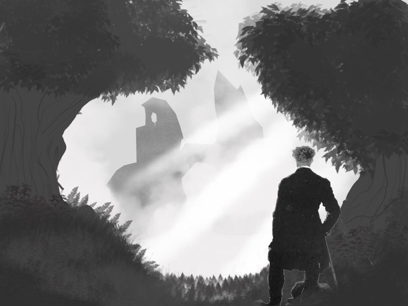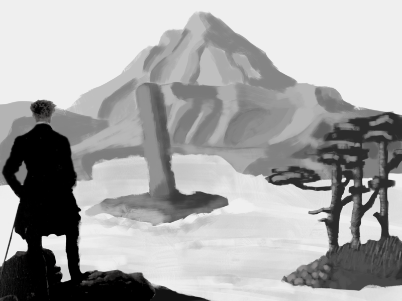 „Sobald ich den Ausschnitt des Bildes gesehen habe, hatte ich das Gefühl, dass der Wanderer auf etwas schaut. Ich war mir aber nicht sicher, wonach er schauen könnte. Ich hatte zwei Ideen. Zum einen, zu einem Wasserfall… zum anderen zu einem mysteriösen Monument. Da mir das Mysteriöse mehr gefiel und mir noch weitere „Design-Ideen“ einfielen, entschied ich mich für das mysteriöse Monument. Es sollte alt, fremd und aus einer anderen Zeit sein. Daher wollte ich auch eine unbekannte Schrift mit einbringen, welche in dieses Monument eingraviert war. Die Schrift baut auf dem normalen Alphabet auf. Die Buchstaben habe ich lediglich gedreht, gespiegelt, Striche weggenommen oder Teile hinzugefügt und auch mal alles kombiniert. Die Schrift habe ich extra so groß gemacht, um das Monument noch mysteriöser erscheinen zu lassen, da es fast unmöglich ist, dass ein Mensch so etwas herstellen kann und somit es vielleicht aus einer anderen größeren Zivilisation stammt. Die beiden Schwarz-Weiß-Bilder waren weitere „Skizzen“ um einen anderen Ort, eine andere Komposition oder sogar ein anderes Objekt zu finden. Ich musste lange überlegen, welche Idee mir besser gefiel. Eine Burg im Nebel oder ein „klares“, aber auch undefinierbares Monument. Ich entschied mich für letzteres, da so viel mehr Interpretationsraum gegeben wird.“