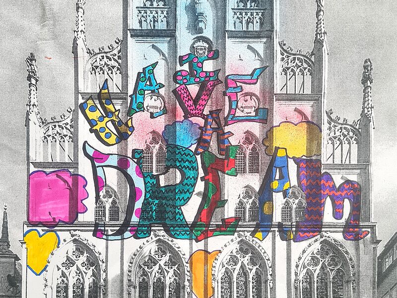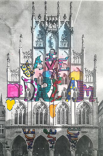 „I HAVE A DREAM“ Marla Holtkötter aus der Klasse 7d hat die berühmten Worte Martin Luther Kings auf die Fassade des alten Rathauses direkt in der Innenstadt von Münster gebracht. Diese Botschaft wird von den Säulen „Peace“ (Frieden), „Love“ (Liebe) und „Justice“ (Gerechtigkeit) getragen. Ein Apell der am Ort, an dem der westfälische Frieden 1648 geschlossen wurde, nicht aktueller und wichtiger sein könnte.