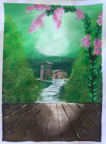 Das Kunstwerk des Monats Oktober von Eylem Topyürek zeigt ein Gebäude mit Turm aus Holz inmitten einer blühenden Landschaft. Im Vordergrund wird eine Art Holzboden gezeigt, der Assoziationen einer Bühne weckt.