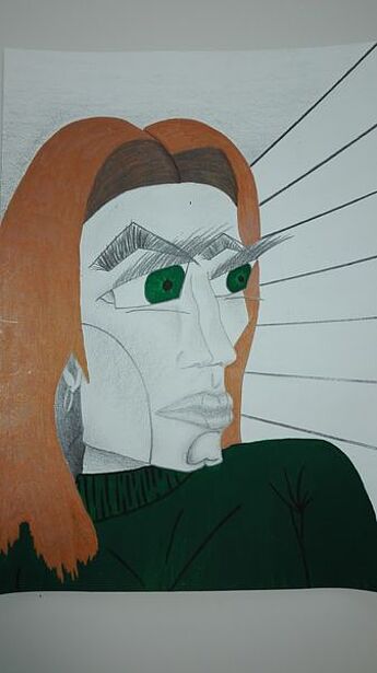 Bei dem Kunstwerk des MonatsAugust handelt es sich um eine Buntstiftzeichnung zum Thema „polyperspektivisches Porträt“ von Cedric Lammert aus der aktuellen Q2. Entstanden ist die künstlerische Arbeit in Anlehnung an das abiturrelevante Thema „Künstlerische Sichtweisen und Haltungen zwischen Distanz und Nähe im malerischen Werk (1930 bis 1950) von Pablo Ruiz y Picasso“.