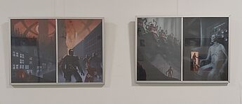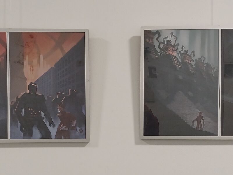 Justus Phillipp, erweitert das Porträt in seinen Werken mit urban anmutenden Motiven und zeigt uns ein düsteres futuristisches Bild des Menschen im Zusammenhang mit KI. Dafür nutzt er digitale Zeichenapps und schafft in penibler Kleinarbeit eine neue Welt. Er selber sagt dazu: „Ein Zeitreisender erkundet eine fremde Welt, in der künstliche Intelligenz der Menschheit alle Mühen und Arbeiten abgenommen hat.“