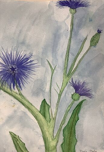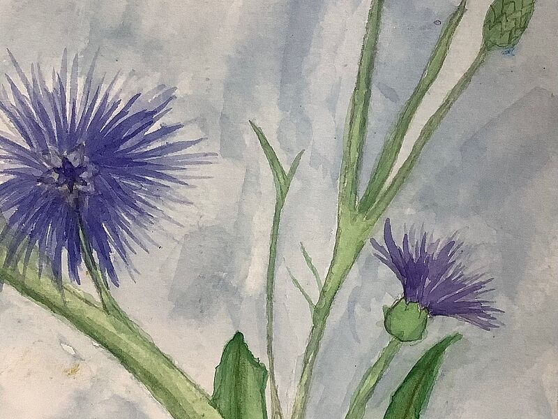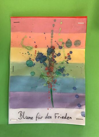 Die Blumen von Clara und Karla zeigen zwei äußerst gut gelungene Ergebnisse von eigenen erfundenen Blumen. Dabei besticht die Blume von Clara, die in ihrer Form- und Farbgestaltung an eine Kornblume erinnern könnte, durch den gezielten und gekonnten Gebrauch von Aquarellfarbe und -technik (Lasieren und Lavieren) und dem Einsatz des Zufallverfahrens der Pustetechnik. Die erfundene Blume von Karla zeigt eine ganz andere Technik: Hier hat die Künstlerin zwei Blätter übereinandergelegt. Auf der untersten Blattschicht wurden als Hintergrund die Regenbogenfarben als Zeichen für Vielfalt und Frieden gemalt. Auf einem Transparentpapier wurden anschließend gezielt Farben auf das Papier getropft und mit einem grünen Stängel zu einer wahren Friedensblume vervollständigt. So unterschiedlich die beiden Blumen in ihrer Gestaltung sind, haben sie doch eins gemeinsam: Den Wunsch nach und ein Statement für FRIEDEN!