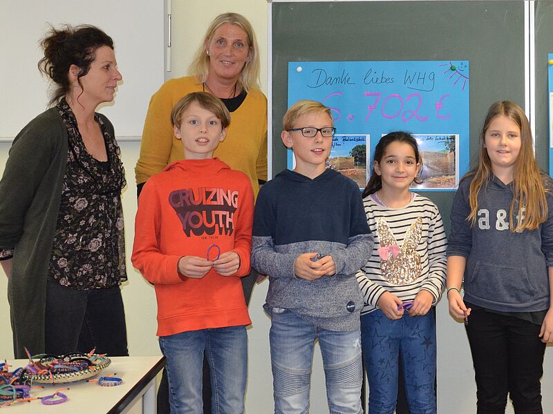 Auf Initiative von Eltern und Schülern haben sich Schülerinnen und Schüler, Eltern und Kolleginnen und Kollegen mit Heike Rath von „Lichtstrahl Uganda“ getroffen und gemeinsam überlegt, wie man als Schule und Hilfsorganisation zusammenarbeiten kann. Entstanden ist so eine Arbeitsgruppe, die sich zur Aufgabe gemacht hat, Bildung, Information und Unterstützung zu verzahnen. So ist während der Projekttage der Schule eine Fotoausstellung entstanden, die den Alltag der Kinder in Gulu und Münster zeigt und im Januar eröffnet wird. Auch hier wird deutlich, dass eine zentrale Herausforderung die langen Schulwege der Kinder im Norden Ugandas ist. Daher lag es auf der Hand, diesem Mobilitätsproblem mit Fahrrädern zu begegnen, die von der Organisation vor Ort demnächst zur Verfügung gestellt werden. Um die Nachhaltigkeit zu sichern und jungen Männern eine Perspektive geben zu können, ist der Bau einer Radstation geplant. Zur Finanzierung dieser Radstation führte das Wilhelm-Hittorf-Gymnasium ein Sportfest durch, bei dem sportliche Leistungen von Sponsoren zusätzlich gewürdigt werden konnten. Insgesamt kamen so 6702€ zusammen, so dass mit dem Bau der Radstation bereits begonnen werden konnte. Zusammen mit Schülerinnen und Schülern, Eltern und Kolleginnen und Kollegen freuten sich Schulleiter Christian Schrand und Heike Rath von Lichtstrahl Uganda über diese gelungenen Aktion.