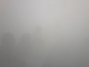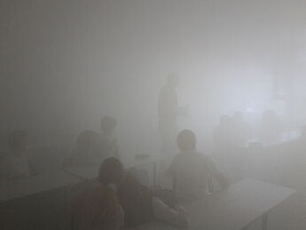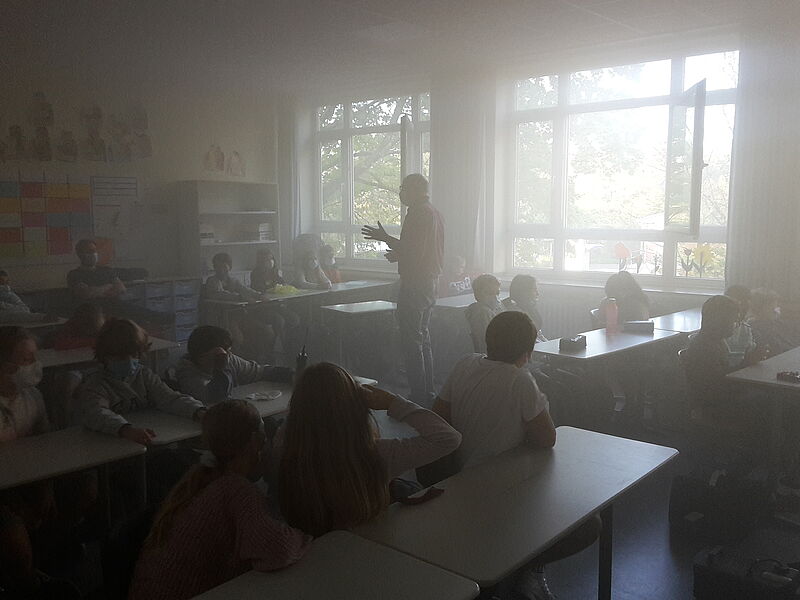 Herr Ackermann führte in den Klassen ein Experiment durch, bei dem die Kassenzimmer mit einer Nebelmaschine mit Nebel befüllt wurden, sodass die Schülerinnen und Schüler die Reihen vor sich nur noch mit Mühe erkennen konnten. Im Anschluss daran wurde auf zwei verschiedene Arten gelüftet. Im ersten Durchgang wurden die Fenster nur auf Kipp geöffnet. Beim Kipplüften konnte jedoch nur sehr wenig Nebel aus dem Klassenraum entweichen und nach einer Wartezeit von über fünf Minuten hat sich die Sicht im Raum nur minimal verbessert. Darum wurde im zweiten Durchgang getestet, wie gut das Stoßlüften funktioniert. Sobald alle Fenster im Raum weit geöffnet waren, entwich eindeutig mehr Nebel und die Sicht verbesserte sich. Nach circa fünf Minuten war kaum noch Nebel im Raum. Die Schüler der Umwelt-AG konnten beobachten, dass der Nebel in der ersten Stunde, als es noch relativ kalt war, schneller entwich als in der vierten Stunde. Sie zogen aus ihren Beobachtungen das Fazit, dass der Luftaustausch sowohl von der Größe der Fensteröffnung als auch vom Unterschied der Temperatur im Klassenzimmer zur Außentemperatur abhängig ist.