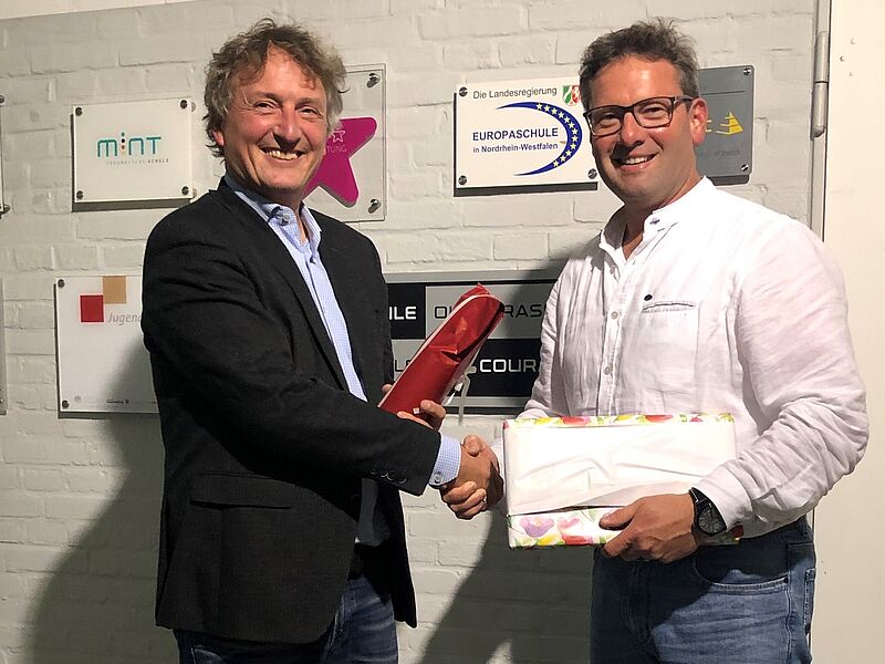 Auf der Schulpflegschaftssitzung am vergangenen Mittwoch trat Herr Dombrowski als Schulpflegschaftsvorsitzender nicht mehr an. Zwei Jahre übernahm er dieses Amt und war für alle Eltern ein wichtiger und geschätzter Ansprechpartner. Gerade die Zusammenarbeit mit den Lehrern und der Schulleitung war von Offenheit, Vertrauen und Wertschätzung geprägt. „Schule kann man nur gemeinsam weiterentwickeln“, nicht nur darin waren und sind sich Marcus Dombrowski und Christian Schrand einig. Als Mitglied der Schulkonferenz bleibt Dombrowski der Schule aber erhalten. Neuer Schulpflegschaftsvorsitzender ist Uwe Landheer geworden.