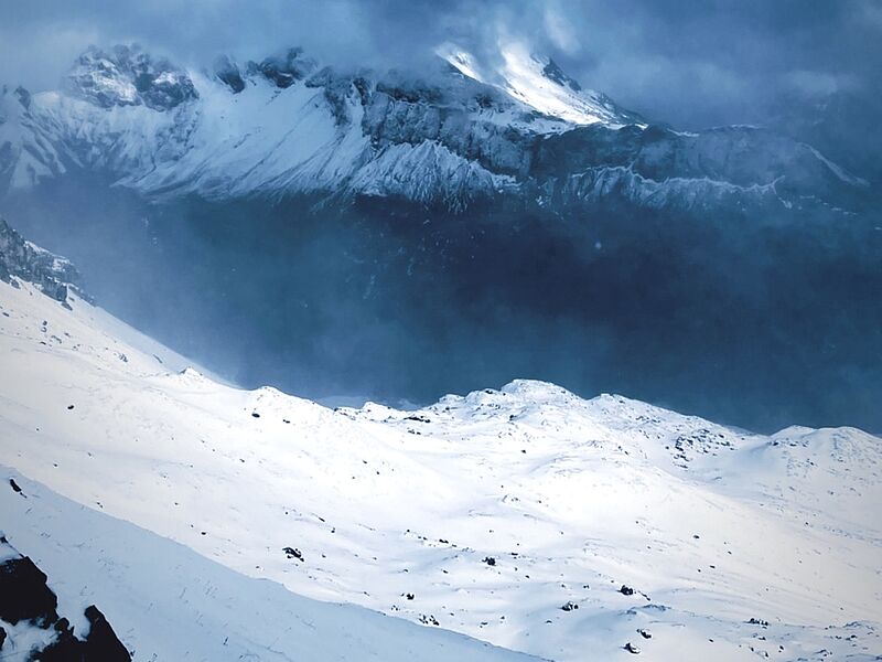 Unsere Bergführer Thomas und Andrea, ohne die wir wahrscheinlich nicht einmal an der zweiten Hütte angekommen wären, bereiteten uns schon darauf vor, dass der kommende Tag der intensivste werden würde und da sie, wie sich im Laufe der Woche herausstellte, immer recht behalten mussten, trat dieser Fall auch ein. Spätestens auf 2000 Metern wurde dann auch den Unverbesserlichsten klar, dass die ausgehändigten Spikes wirklich von Vorteil sind. Doch der langwierige Aufstieg hat sich spätestens dann gelohnt, als sich uns ein an das Himalaya erinnernde Panorama bot, während wir auf einem teilweise selbstgetretenen Weg am Hang Richtung Mindelheimer Hütte unterwegs waren. Halb rutschend, halb laufend bewältigten wir auch das letzte steile Teilstück und waren froh, in der Hütte angekommen zu sein.