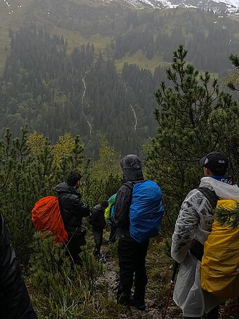 Anish, zeitweise von Herrn Heinrich begleitet, mussten wir an dieser Stelle leider verabschieden, nachdem ihr Knie nicht so mitmachte, wie es eigentlich sollte. Ohne die beiden gingen wir also bei konstantem Regen und mit durchweichten Klamotten los, wobei die von uns geforderte Anzahl der Pausen bedauerlicherweise nicht der Auffassung von Thomas und Andrea entsprach, sodass wir uns, um eine häufig genutzte Bezeichnung der Lehrpersonen zu verwenden, „nölend" den Berg hinaufkämpften. Nach einiger Zeit war jedoch auch das bewältigt und beinahe vollzählig verbrachten wir den Nachmittag auf der Hütte. Ein paar Stunden und einige Kaiserschmarren später kam dann auch Herr Heinrich, vorsichtig formuliert, völlig ausgelaugt auf der Hütte an, der auf Nachfrage von Frau Reinhart und Herrn Stratmann während des stundenlangen Individualwanderns viel über sein Leben nachgedacht habe.