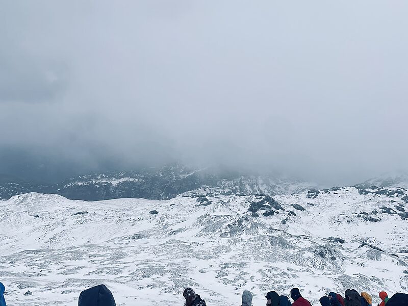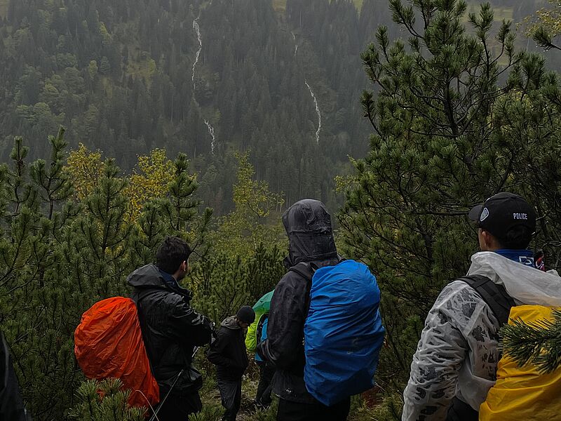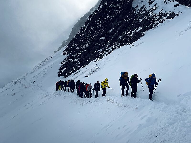 Mit maximal 1,5 Stunden Schlaf kamen wir am nächsten Morgen am Bahnhof in Oberstdorf an und bei dem ein oder anderen löste das Willkommenheißen der Bergschule gehörigen Respekt aus, als wir vom Schnee im Gebirge hörten und im gleichen Atemzug mit Schneeketten ausgestattet wurden. Doch am ersten Tag war davon wenig zu spüren und so regnete es eher, als dass es schneite. Uns war zu dem Zeitpunkt aber nicht klar, dass der Aufstieg zur Schwarzwasserhütte eher eine Art Einführungsrunde darstellte, denn was am nächsten Tag folgen sollte, war nicht aus der Kategorie alpiner Erholungsurlaub.