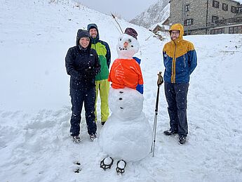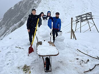 Am nächsten Vormittag stand dann Programm in und um die Hütte an. Nachdem der Auf- und besonders Abstieg zur nahegelegenen Großen Steinscharte in einem Massenrutschen endete, entschieden sich fünf Macher (Per, Kleris, Tobi, Ole, Anas) und Herr Heinrich, bei Temperaturen um den Gefrierpunkt in den 4 Grad kalten Rappensee zu springen. Frierend, aber glücklich schafften sie sogar den zehnminütigen Weg zurück zur Hütte, wo es zwar gefühlt nicht viel wärmer aber zumindest trocken war.