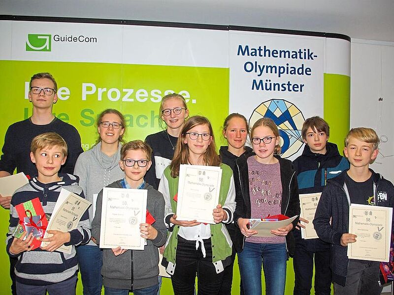 Gekommen waren auch die Schulleiter der beteiligten Gymnasien, um ihren Schützlingen ebenfalls zu gratulieren und ihnen ihre Wertschätzung zu erweisen. Auf dem Siegertreppchen standen Anna Sornig (Klasse 5, Annette-von-Droste-Hülshoff-Gymnasium), Fabian Schmidt (6, Gymnasium Paulinum), Marten Queißert (6, Freiherr-vom-Stein-Gymnasium), Annalena Göcke (7, Marienschule), Arne Saphörster (8, Kardinal-von-Gal en-Gymnasium), Nikolai Jen Ki (9, Annette-von-Droste-Hülshoff-Gymnasium), Mia Luca Krusekamp (EF, Marienschule), Alexandra Nigge (Q1, Marienschule), Antonia Riethmüller (Q1, Gymnasium Paulinum) und Anton Fehnker (Q2, Gymnasium St. Mauritz).