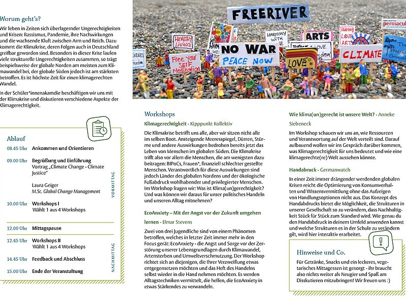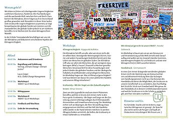 Der Workshop „Klimagerechtigkeit/Kipppunkte" kam nach der Besprechung des Zusammenhangs zwischen Wirtschaftswachstum/ -Politik und Erderwärmung zu dem Schluss, dass die ökonomische Postwachstums-Richtung der Einhaltung unserer Klimaziele förderlich wäre. Gemeint ist, eine gleichmäßigere Verlagerung der Allgemeingüter einzuleiten und den Ressourcenverbrauch zu reduzieren, begonnen etwa mit Gift-Boxen.