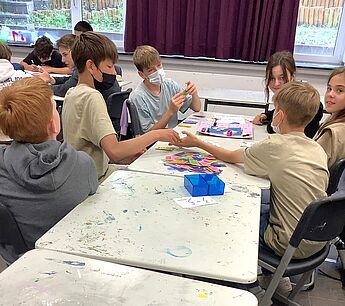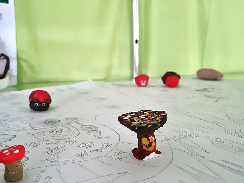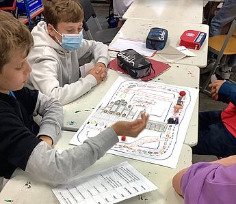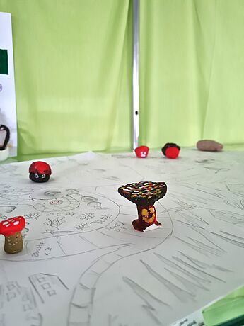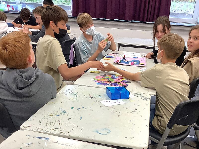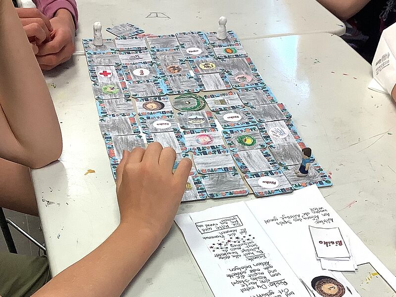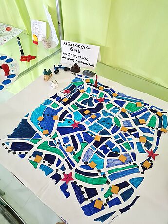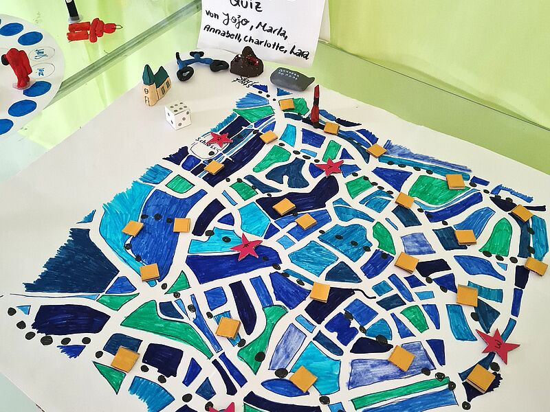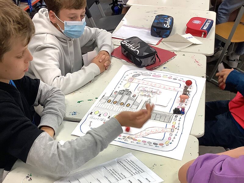 Die Schüler*innen entwarfen Brettspiele mit selbst gewählten Themenschwerpunkten. Bei dem Projekt von Bruno Fühner, Keano Elbers, Noel Brosch, Christian Michael und Ferdinand Gosejohann wurde Münster beispielsweise zum Zauberwald, in welchem sich verrückte Pilze als Spielfiguren heimisch fühlen. Das Brettspiel von Johannes Schröder, Moritz Schmalle, Titus Borgmann und Lasse Schröer brachte hingegen eine popkulturelle Ikone, den Klassiker „Mario Kart“, aufs Spielbrett. Das historische Rathaus wurde als Start und Ziel auserkoren, durch welches die kleinen Spielfiguren düsen. Alle Gruppen bewiesen durch innovative Ideen und Liebe zum Detail gestalterisches und planerisches Können, sowie guten Teamwork, sodass die Spiele der Schüler*innen ein vollumfängliches Spielerlebnis ermöglichen, welches in der letzten Kunststunde vor den Ferien ausgetestet wurde.