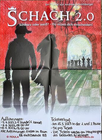 wir, aus dem Projektkurs Musical der siebten Klasse, haben eine große Ankündigung zu machen: Am 6.6.23 um 18 Uhr und am 12.6.23 um 18 Uhr führen wir das Musical "Schach 2.0" im alten Musiksaal (Raum B6) auf, welches wir in diesem Schuljahr geprobt haben.