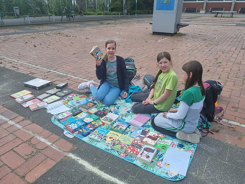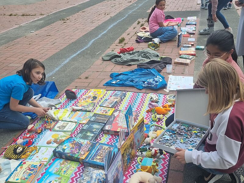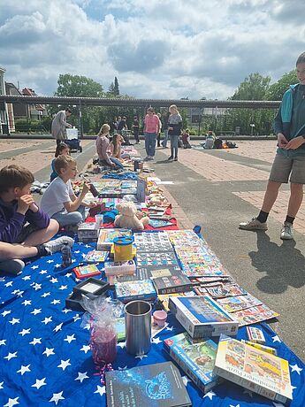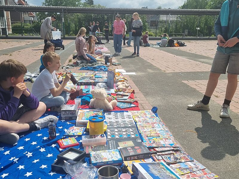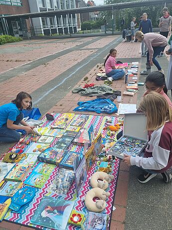 Alle Kinder der Klassen 5 bis 8 waren eingeladen, einen Stand aufzubauen und Dinge zum Verkauf anzubieten, die nicht mehr gebraucht, aber in neue Hände abgegeben werden können. Besonders der Nachhaltigkeitsgedanke "Weitergeben statt Wegwerfen" stand dabei im Vordergrund. Der Flohmarkt war eher klein, dennoch wechselten einige Bücher, Gesellschaftsspiele, Fußballsticker-Sammelbände und Kuscheltiere die Besitzer:innen.