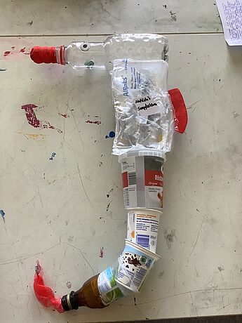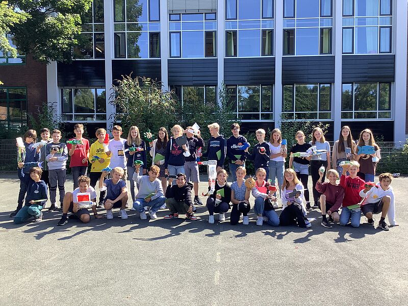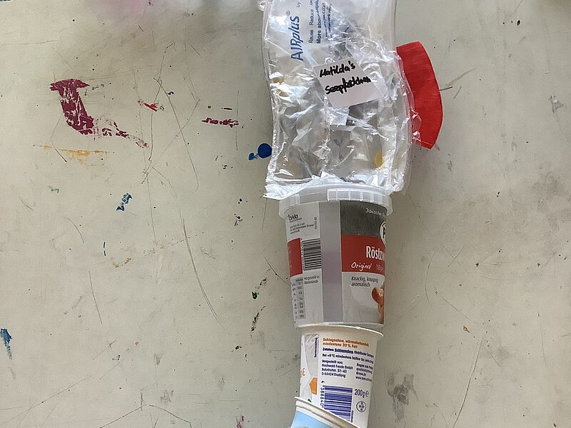 So entstand die Idee, im Cafe Tante August eine gemeinsame Ausstellung aufzubauen, bei der nicht nur die Plastik-Meereslebewesen ausgestellt, sondern auch Postkarten für einen guten Zweck verkauft wurden. Der Erlös ging an „Viva con Aqua“, eine Organisation, die sich für saubere Meere einsetzt. Für die Sonderaufgabe „Neustart in Europa“ wurden Fotos der Plastik-Tiere sowie der Ausstellung eingereicht und die Jury konnte von dem nachhaltigen Projekt der 7.-Klässlerinnen und 7.-Klässler überzeugt werden. Neben einem Landespreis NRW räumt die Klasse nun auch noch einen Bundespreis (Preis der Kultusministerkonferenz) ab!