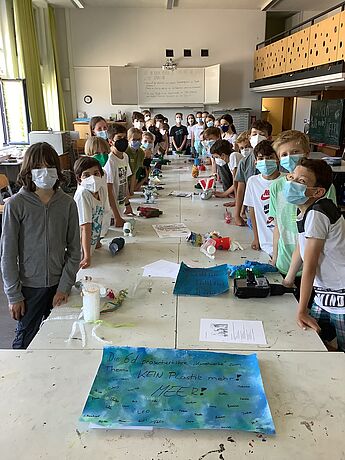 30 Schülerinnen und Schüler der Klasse 7d beschäftigten sich im Kunstunterricht unter der Leitung ihrer Lehrerinnen Frau Voß und Frau Reinhart mit dem Thema „Kein Plastik mehr. Meer“ und gestalteten aus Plastikmüll Meereslebewesen. Aber hier hörte das Engagement noch nicht auf – es ging den Schülerinnen und Schülern, die sehr viel Vorwissen mitbrachten, darum, auch außerhalb der Schule Aufmerksamkeit zu erzielen.